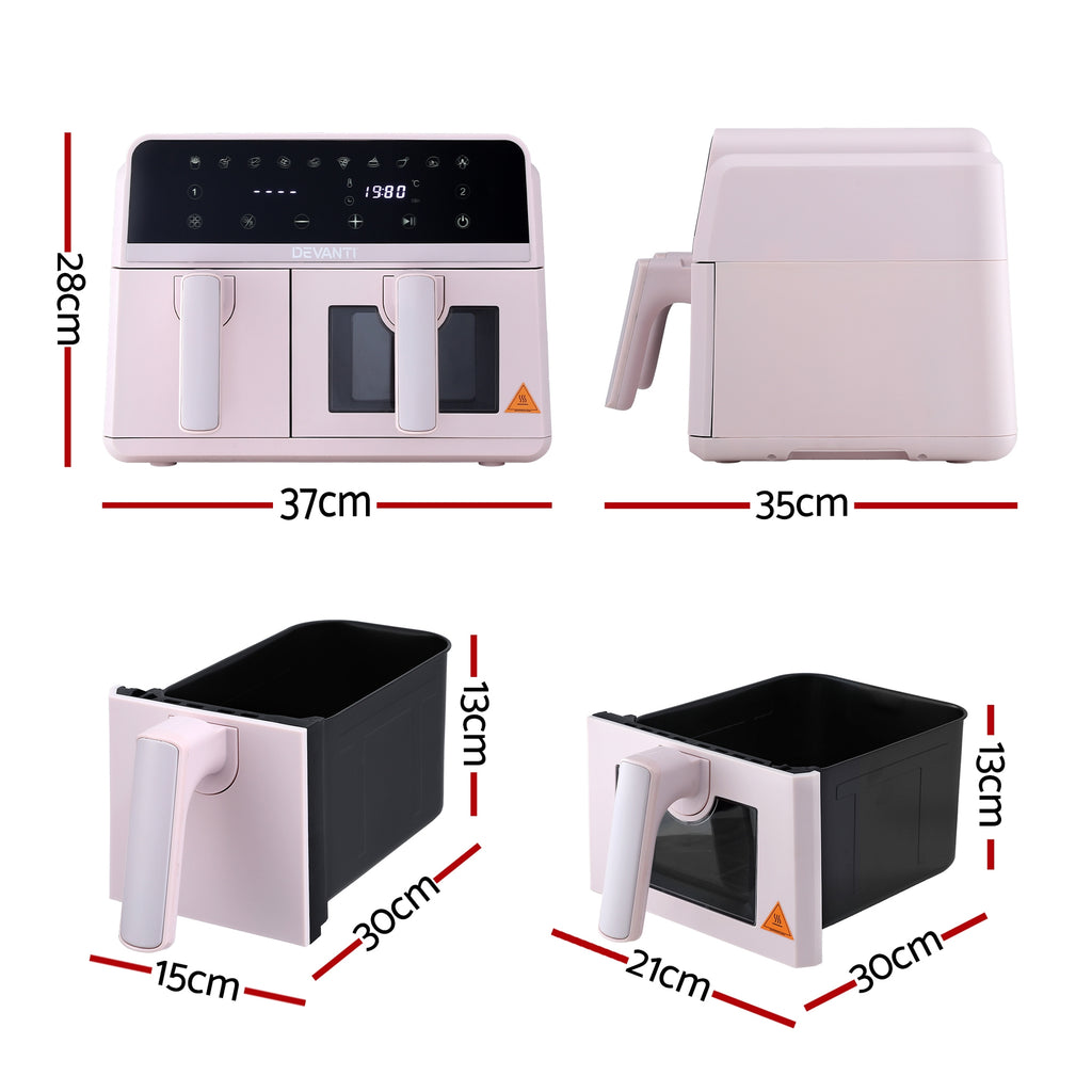 Devanti Air Fryer 9L Dual Zone Fryers 2600W Pink