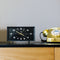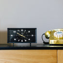 The black retro mid-Century atomic dial is housed in a matt black rectangular case mounted on widely-spaced plinth feet