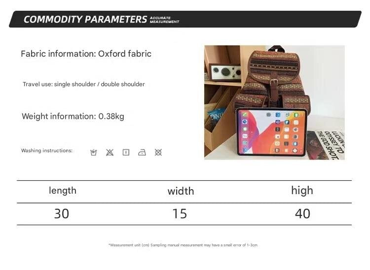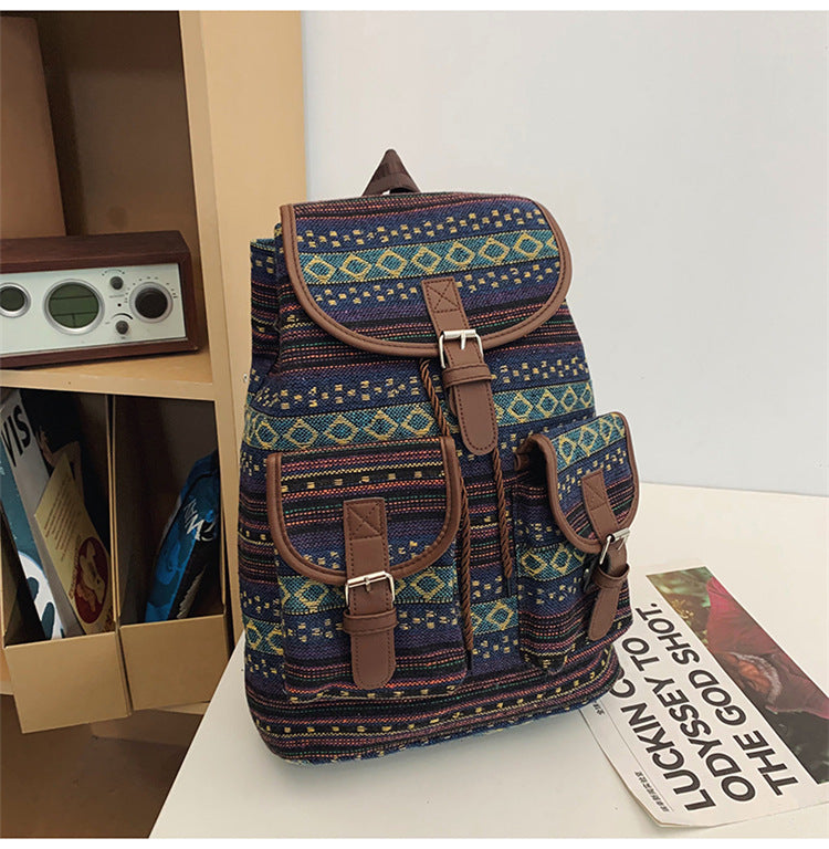 The unique ethnic pattern, combined with the durable canvas construction, makes this backpack both stylish and long-lasting. The drawstring closure and flap with buckle straps add a touch of vintage charm, while the multiple pockets provide ample space for organizing your belongings. Whether you're heading to class, exploring a new city, or attending a festival, this boho backpack is the perfect companion. It is big enough to fit everyday essentials and a book!