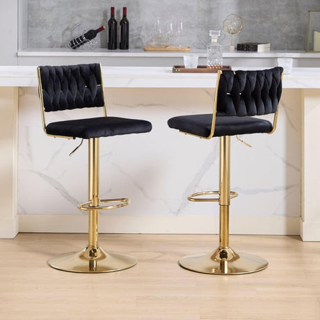 SERENITà 2x Velvet Bar Stools with Braided Back Elegant Kitchen High Chairs, Kitchen Island Stools Adjustable Height Swivel Bar Chairs with Gold Legs for Home-Black