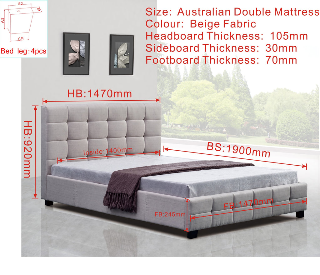 An exceptionally sturdy all-wood frame and support slats provide a rock-solid foundation for your mattress that will surely lead to many restful nights. The Linen Fabric covering is similarly durable, not to mention easy to clean. The frame is designed to accommodate standard Double-sized mattresses with dimensions of 137 x 187 cm (mattress and linens not included). The headboard is 98 cm tall (6cm leg & 92cm headboard) from top to bottom, and the overall dimensions of the bed frame are 190 cm x 147 cm.