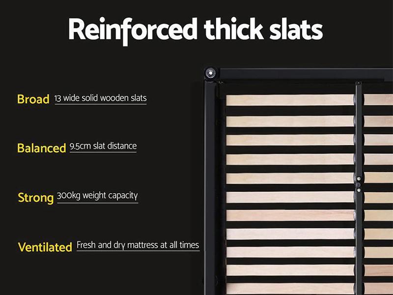 The headboard provides ample space for relaxing and features high density foam for a well padded look. Within the frame, there is a highly flexible wooden arched slat base to allow the bed to flex properly. The sturdy frame is built with reinforced steel bars and held together by heavy duty metal connectors for durability and stability. Arriving in a flat pack, the Palermo Fabric Bed Frame presented by 360Homeware, is easy to put together and can provide the necessary support needed for a good night's sleep.