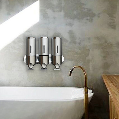 With its sleek, ergonomic design, this shower soap dispenser looks great in your shower. Install another one near your sink and keep your benchtops free from clutter. With three separate canisters attached to a single bar, the dispenser can store three different kinds of soaps, shampoos, lotions, or gels.
