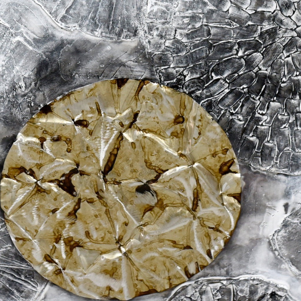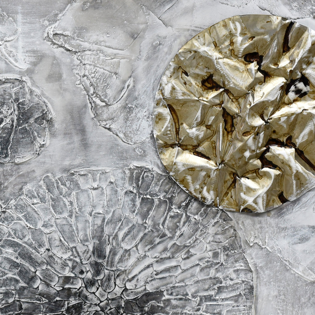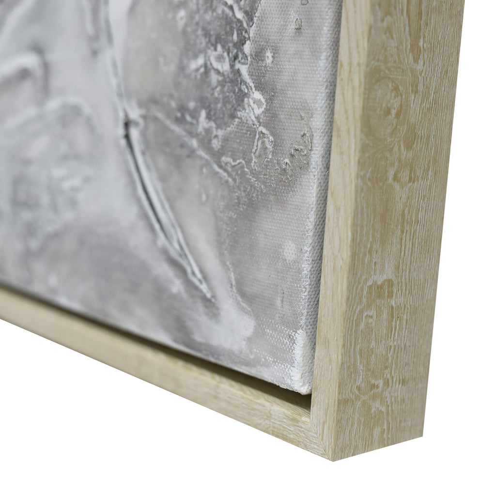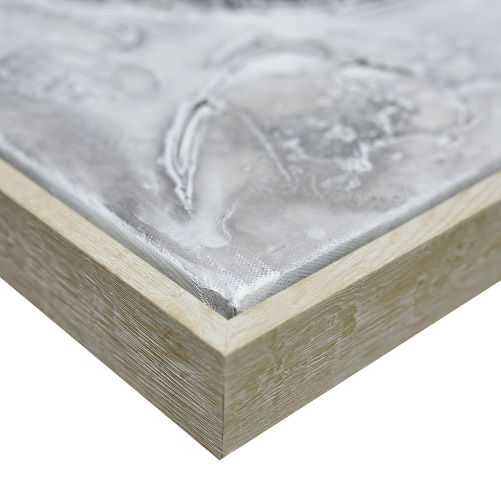 "Golden Orbs Amidst Ethereal Mists" is a mesmerizing 100cm x 100cm hand-painted canvas that transports viewers to an otherworldly realm. The artwork showcases an entrancing blend of texture and hue, framed exquisitely in light wood that amplifies its organic allure. Dominating the scene, two textured gold spheres emanate a radiant glow, grounding the composition and offering a luminous contrast to the surrounding elements. A delicate dance of five grey bubbles, each bursting with tangible texture, hovers nearby, suggesting movement and fluidity. The background whispers tales of distant horizons as fainter bubbles, mere suggestions of form, emerge from the white and grey stone-washed backdrop. Each layer of this piece beckons closer inspection, making "Golden Orbs Amidst Ethereal Mists" a captivating addition to any art collection or living space.