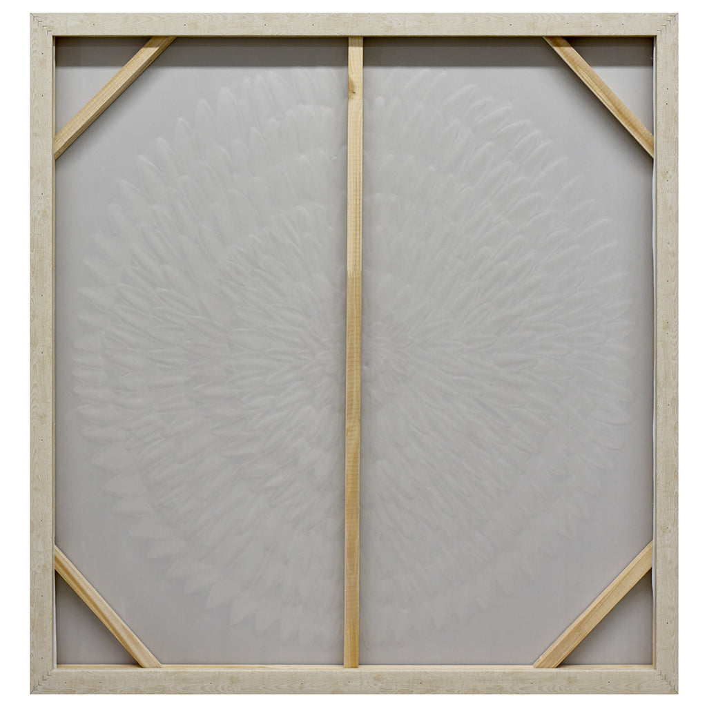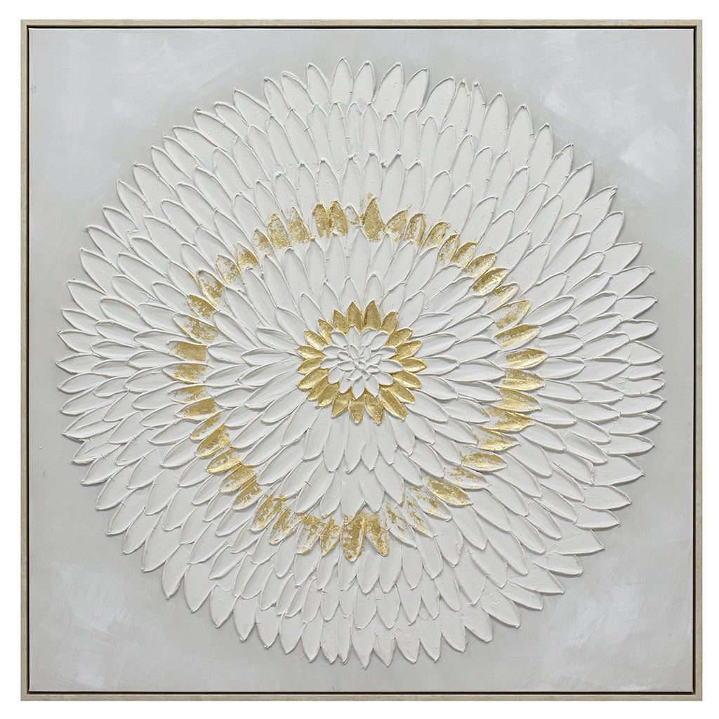 An evocative hand-painted masterpiece, "Lustrous Celestial Harmony" spans an impressive 100cm x 100cm canvas, framed beautifully with light wood that complements the primary white palette. The artwork captivates with a mesmerizing circular design, invoking the cyclical nature of life and the universe. At its core, two intertwined gold rings emerge, symbolizing unity and eternal bond. Interspersed throughout are delicate petal motifs, representing nature's bloom and ephemeral beauty. Soft, ethereal feathers dance around the periphery, adding an essence of freedom and fragility. The thick texture technique utilized gives depth and dimension, inviting the viewer to get lost in its myriad intricacies. Every brushstroke tells a story, making "Lustrous Celestial Harmony" an enchanting conversation piece for any space.
