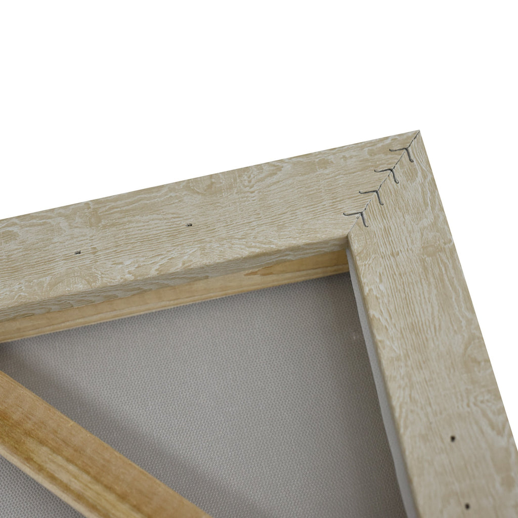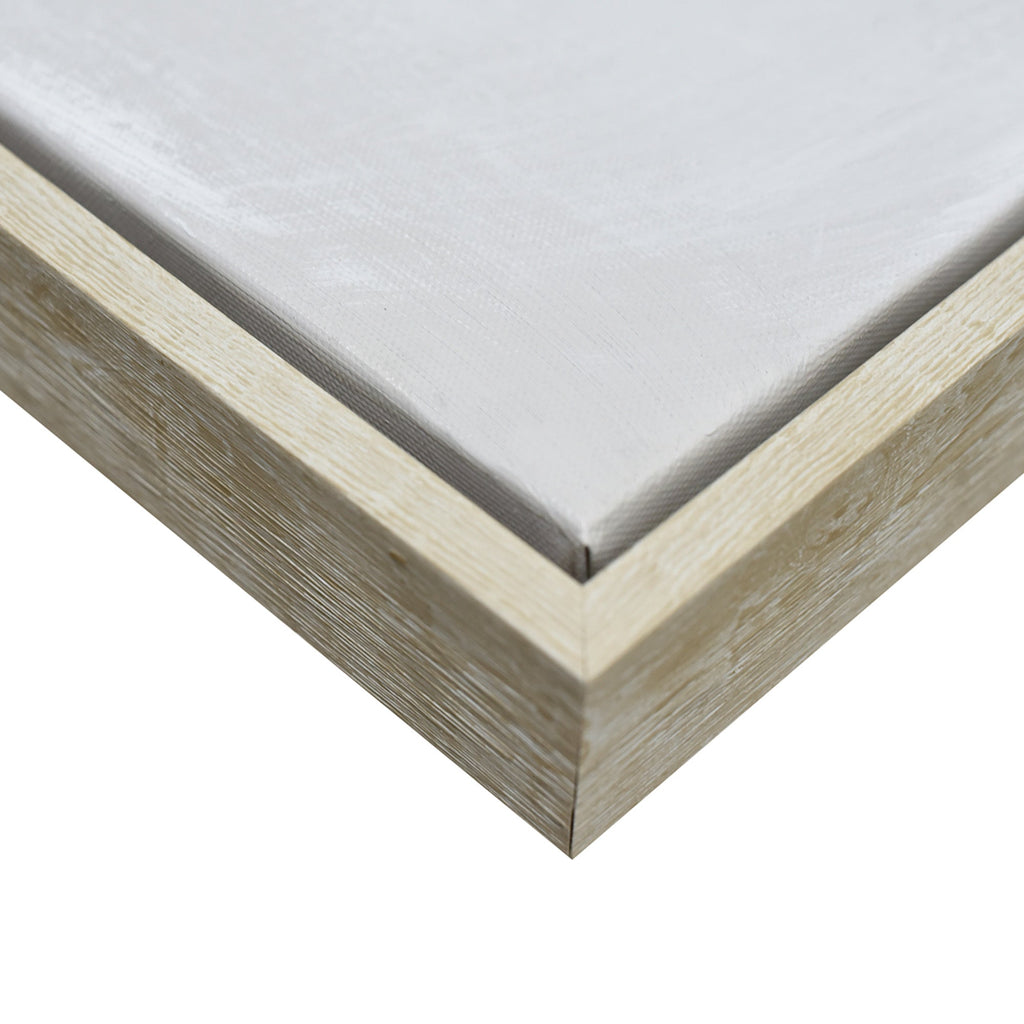 Stretched and gallery wrapped around a wooden stretcher and finished with a floating frame. There is a gap between the frame and print, which creates the floating effect and literally makes the canvas print stand out even more.