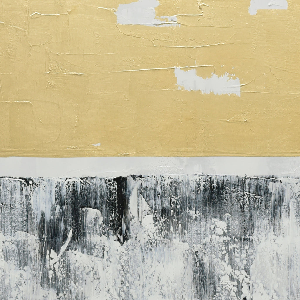"Tonal Trilogy" is an art piece of striking simplicity and profound depth, measuring 120cm x 120cm. Divided into three distinct horizontal stripes, each segment tells its own story. The top section gleams with a luxurious gold, imbuing the canvas with warmth and opulence. This transitions into the central stripe, a unique blend of white-washed black that marries light and shadow. The composition culminates with a pure black stripe at the bottom, offering a grounding contrast. Each of these sections is immaculately defined by straight-cut white edges, which not only distinguish the stripes but also add a crisp, contemporary touch. Encased in a sleek black frame, "Tonal Trilogy" exemplifies modern abstract art, balancing bold contrasts with harmonious continuity.