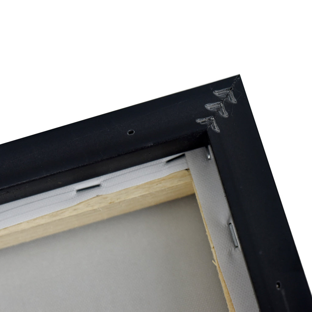 Stretched and gallery wrapped around a wooden stretcher and finished with a floating frame. There is a gap between the frame and print, which creates the floating effect and literally makes the canvas print stand out even more.