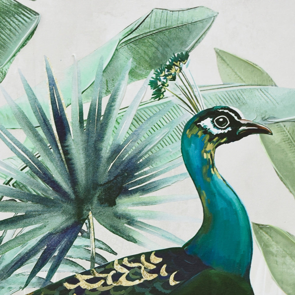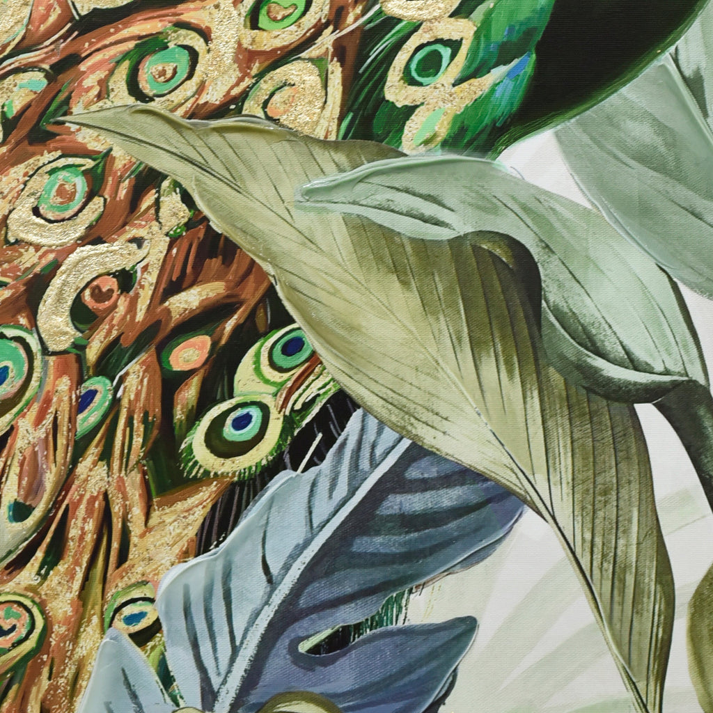 "Golden Plume" is a vibrant celebration of nature's beauty and artistry. At its heart lies a magnificent peacock, its vibrant hues and intricate patterns capturing the essence of this regal bird. Surrounded by abstract florals and leaves, the peacock stands as a beacon of elegance and grandeur. What truly elevates this piece is the meticulous gold accentuation, especially on the peacock's feathers, adding a touch of opulence and making the bird shimmer with every play of light. The artwork is a harmonious blend of hand-painted elements and print, ensuring that every detail is accentuated. Encased in a dark wood frame, "Golden Plume" beckons viewers to delve into the intricacies of the design and appreciate the mesmerizing dance of colors and patterns.