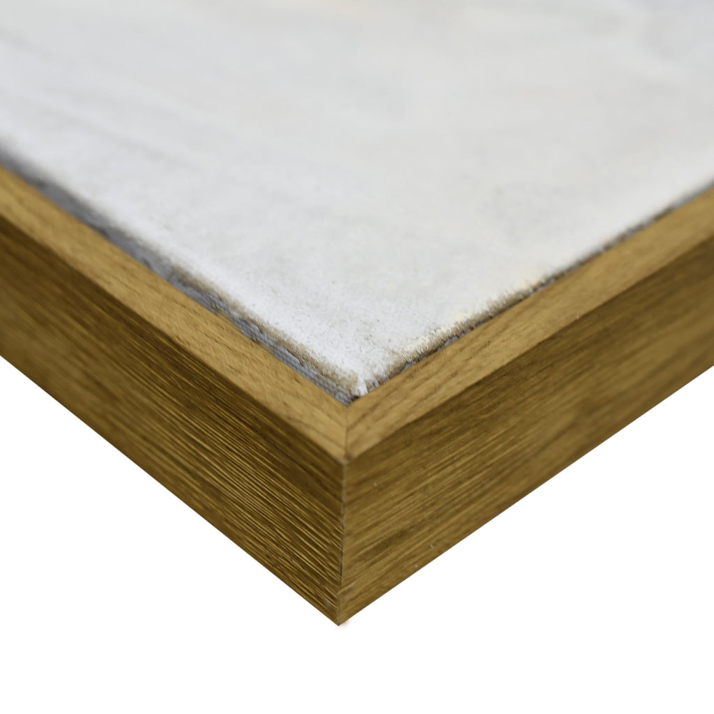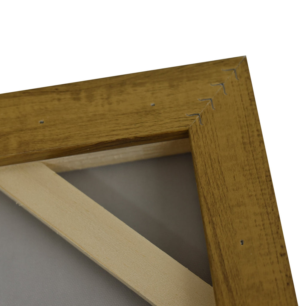 Stretched and gallery wrapped around a wooden stretcher and finished with a floating frame. There is a gap between the frame and print, which creates the floating effect and literally makes the canvas print stand out even more.