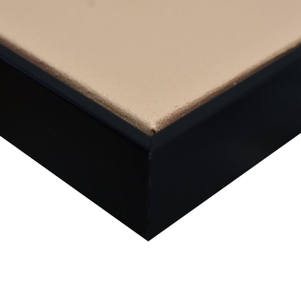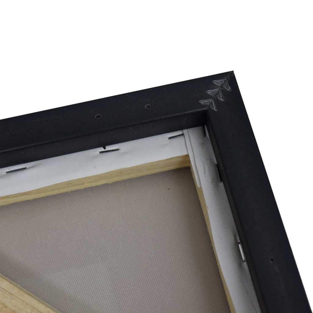 Stretched and gallery wrapped around a wooden stretcher and finished with a floating frame. There is a gap between the frame and print, which creates the floating effect and literally makes the canvas print stand out even more.