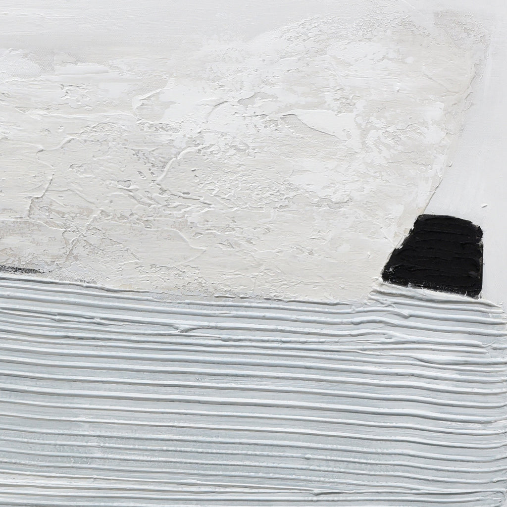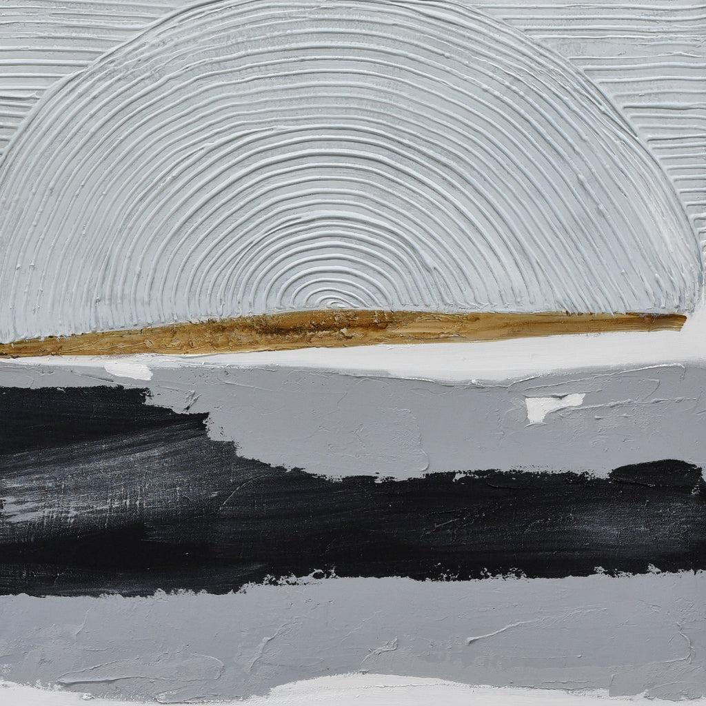 "Vibes of Vellichor" isn't merely art—it's an attitude. Its thick textures and playful contrasts set the stage for a visual dance, encapsulating the vibrancy and dynamism of modern life. Standing before it, one is compelled to groove to its rhythm, to muse, and to lose oneself in its funky narrative. Front and center, a prominent white dash pops against the canvas, acting as a contemporary guide through the labyrinth of hues. Whimsical baby blue grooves, both circular and linear, pirouette around this dash, channeling vibes of cool summer breezes and ocean waves. Moodier shades of grey and deep charcoal layer in, adding complexity and a hint of urban chic. The piece is masterfully unified by a dashing line of gold, a gleaming streak that screams modern luxury.