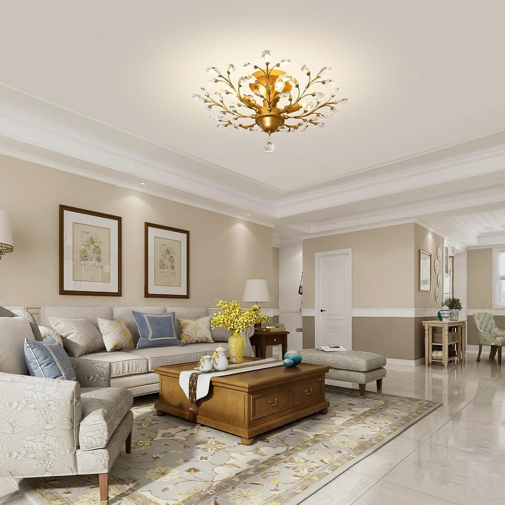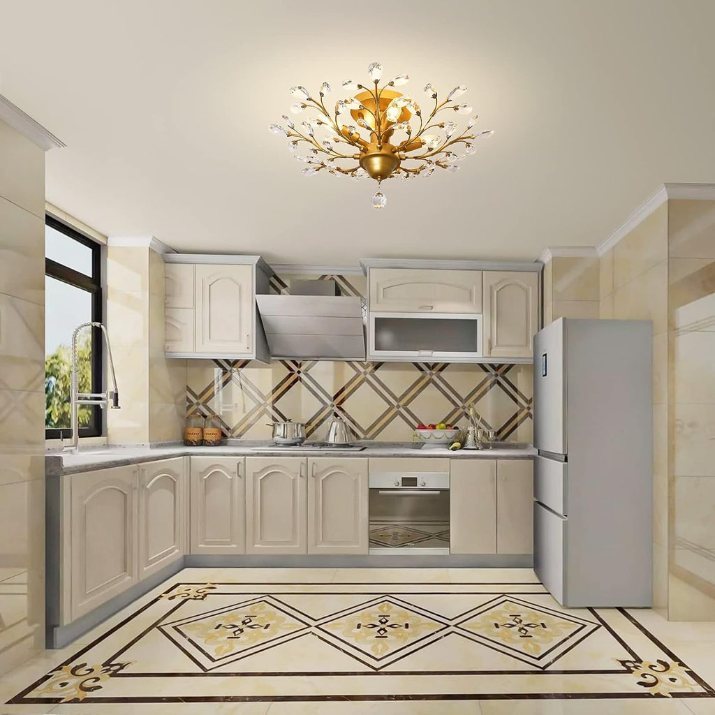 - ELEGANT GLOW: Illuminate your space with this classic gold ceiling light featuring transparent K9 crystals that capture and reflect the light of the bulb. Enjoy a romantic, sweet evening atmosphere with plenty of light and reflection. Easily replace the light bulb to instantly upgrade the look of your home's ceiling.