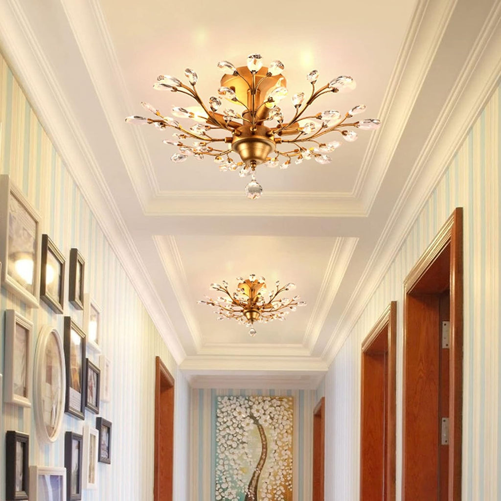 - VERSATILE STYLE: Add a touch of elegance to any room with this stunning crystal ceiling light. Choose from two colors - gold for a classic look or black for a more modern, retro feel - to create the perfect atmosphere in your hallway, bedroom, living room, dining room, kitchen, bar, hotel, balcony, stairwell, children's room, or any other small space. This eye-catching light will be sure to draw attention to your well-appointed space.