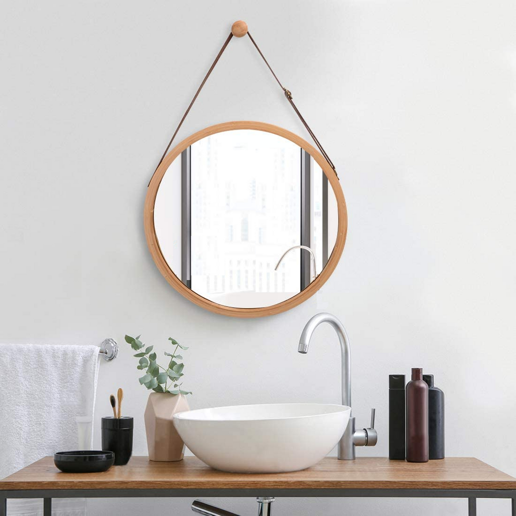 CARLA HOME Hanging Round Wall Mirror 38 cm - Solid Bamboo Frame and Adjustable Leather Strap for Bathroom and Bedroom