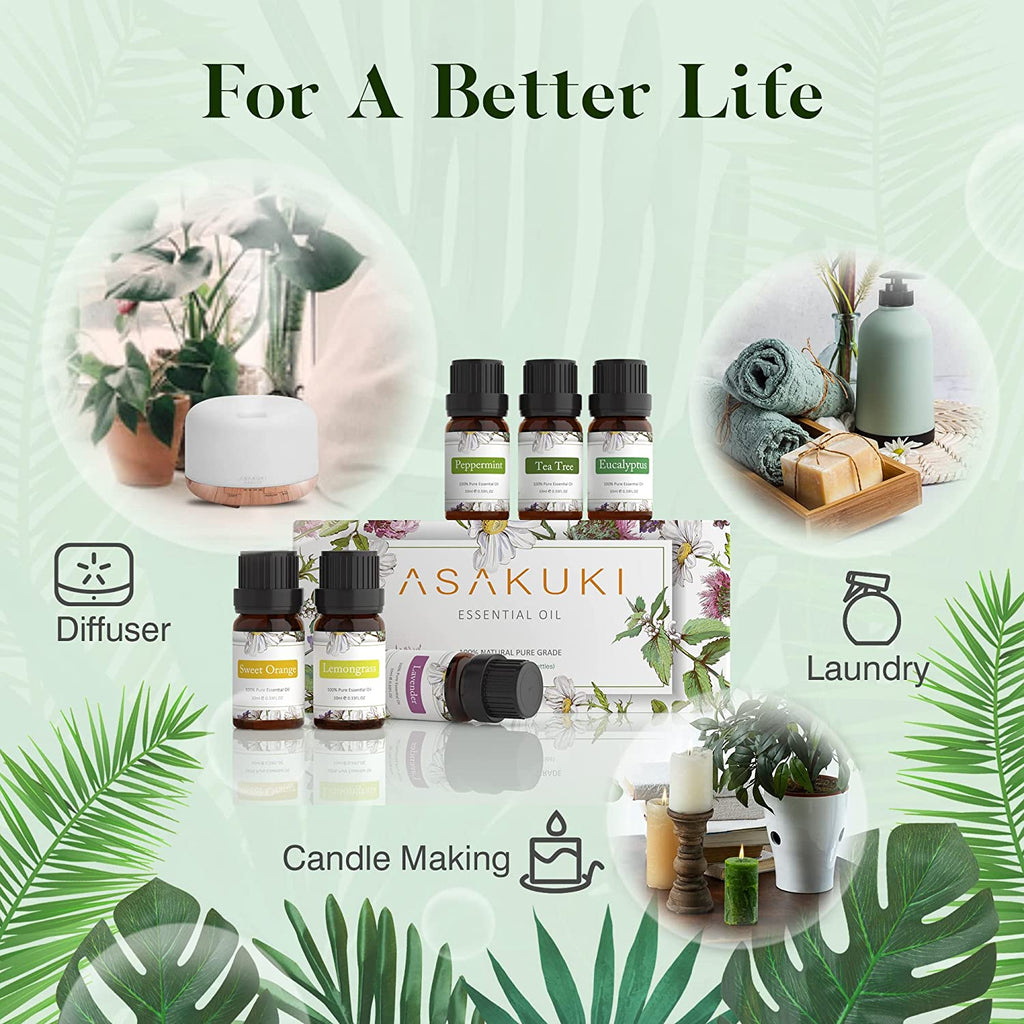 Top 6 Essential Oils Pack – The ASAKUKI aromatherapy essential oils are made with all-natural plant extracts that are safe and effective for daily use, and come in lavender, lemongrass, eucalyptus, tea tree, sweet orange and peppermint.