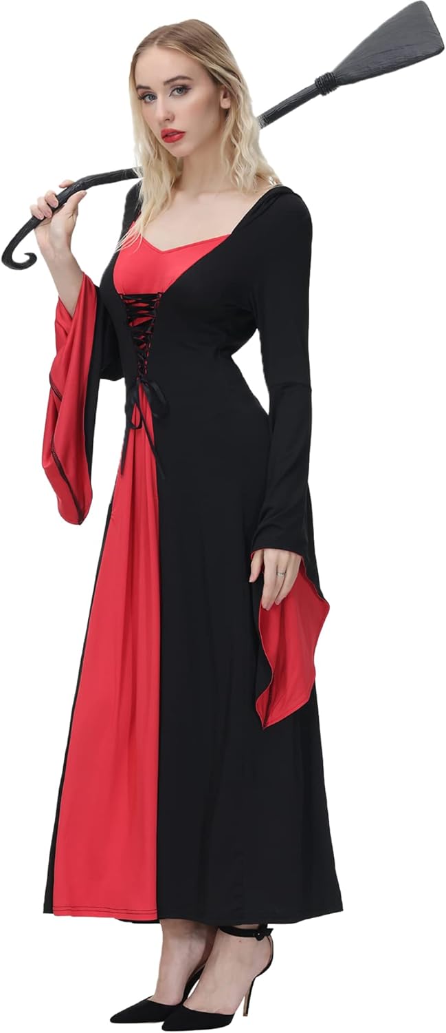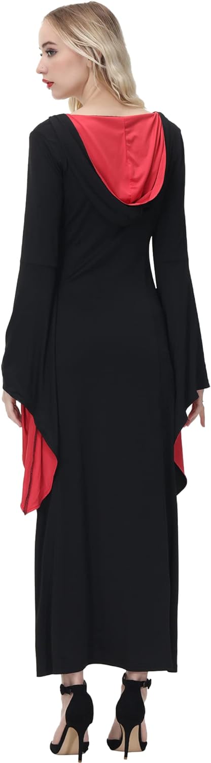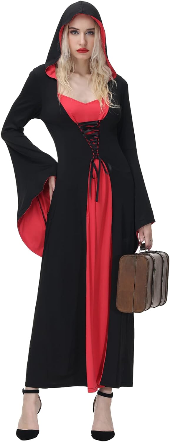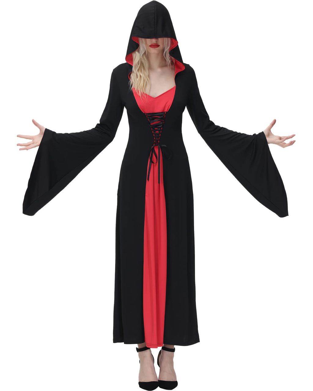 Women Hooded Robe Witch Costume Lace Up Front Halloween Cosplay Long Dresses