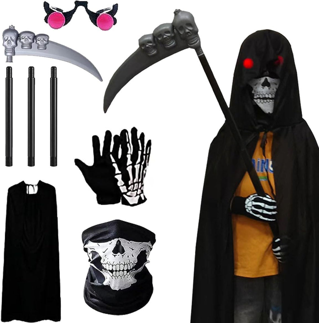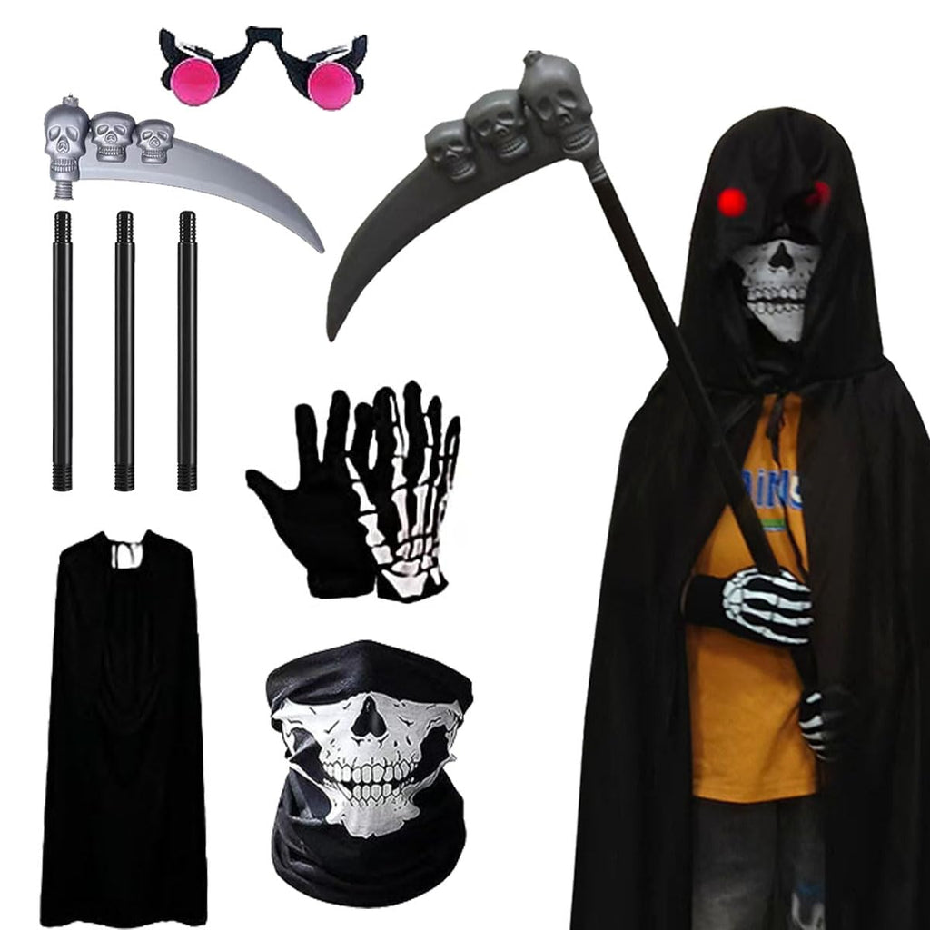 【Grim Reaper Death Robe Set】Come with Black Hooded Cape,Scythe, Grim Glasses, Skull Mask, Skeleton Gloves to complete your Grim Reaper costume.