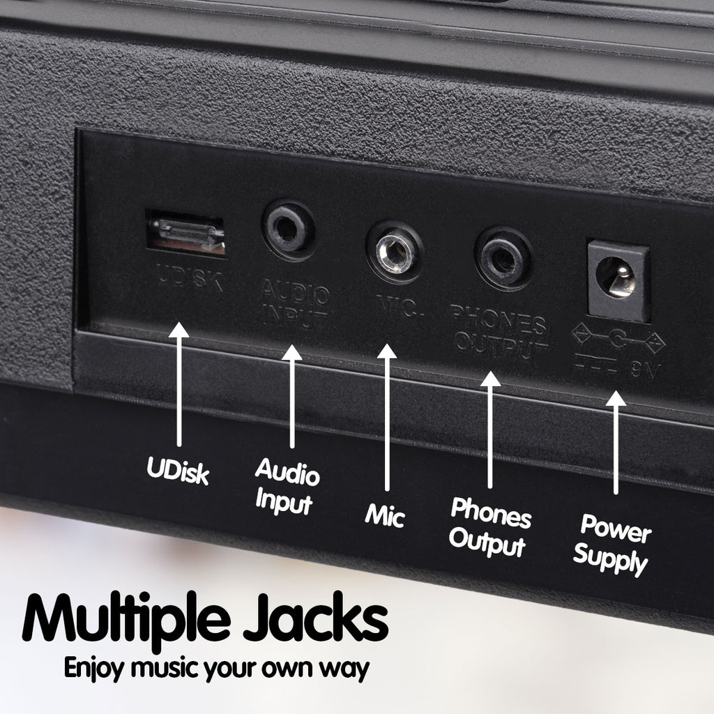 This multi-function keyboard runs on either batteries or wall cord for the ultimate portable convenience. It also comes with a keyboard stand and music sheet holder.