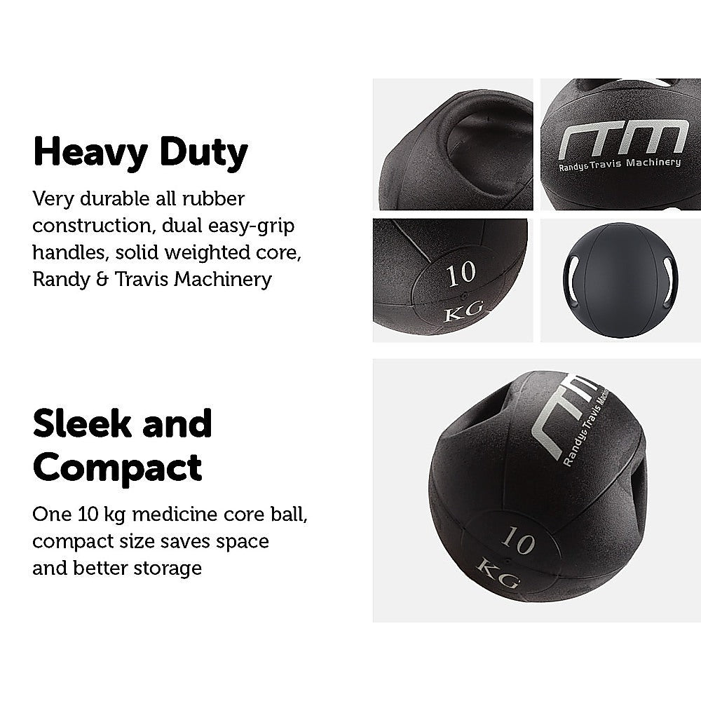 Terrific for athletes looking to increase both strength and explosive quickness, the 10kg Double-Handled Rubber Medicine Ball comes to us from Randy & Travis Machinery, a leader in rugged yet affordable sports and outdoor equipment.