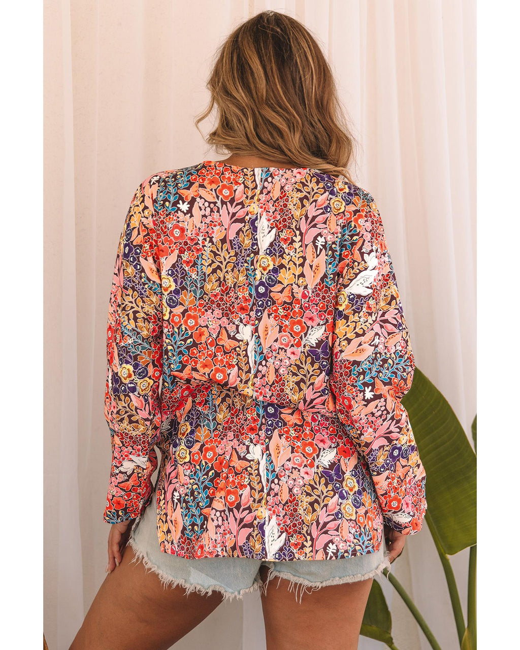 - Multicolor Boho Floral Long Sleeve V-Neck Blouse