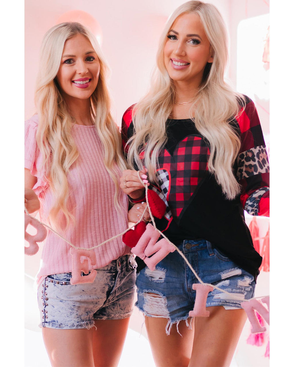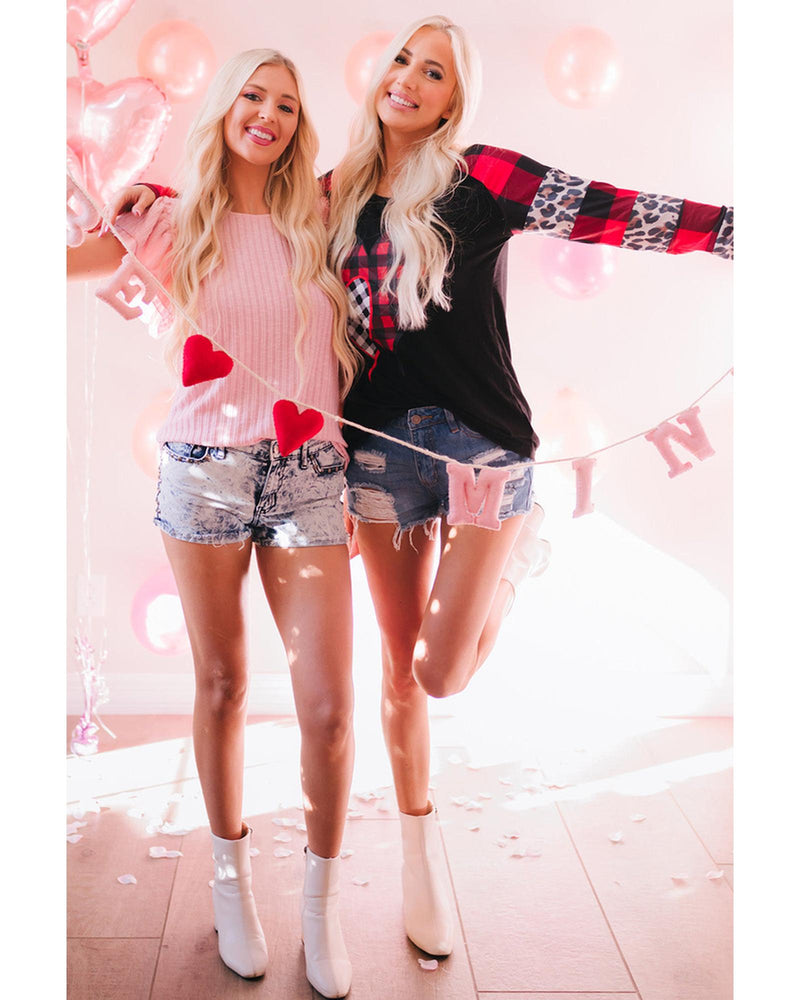 - Stylish and trendy Valentines Heart Print Plaid Leopard Joint Sleeve Blouse