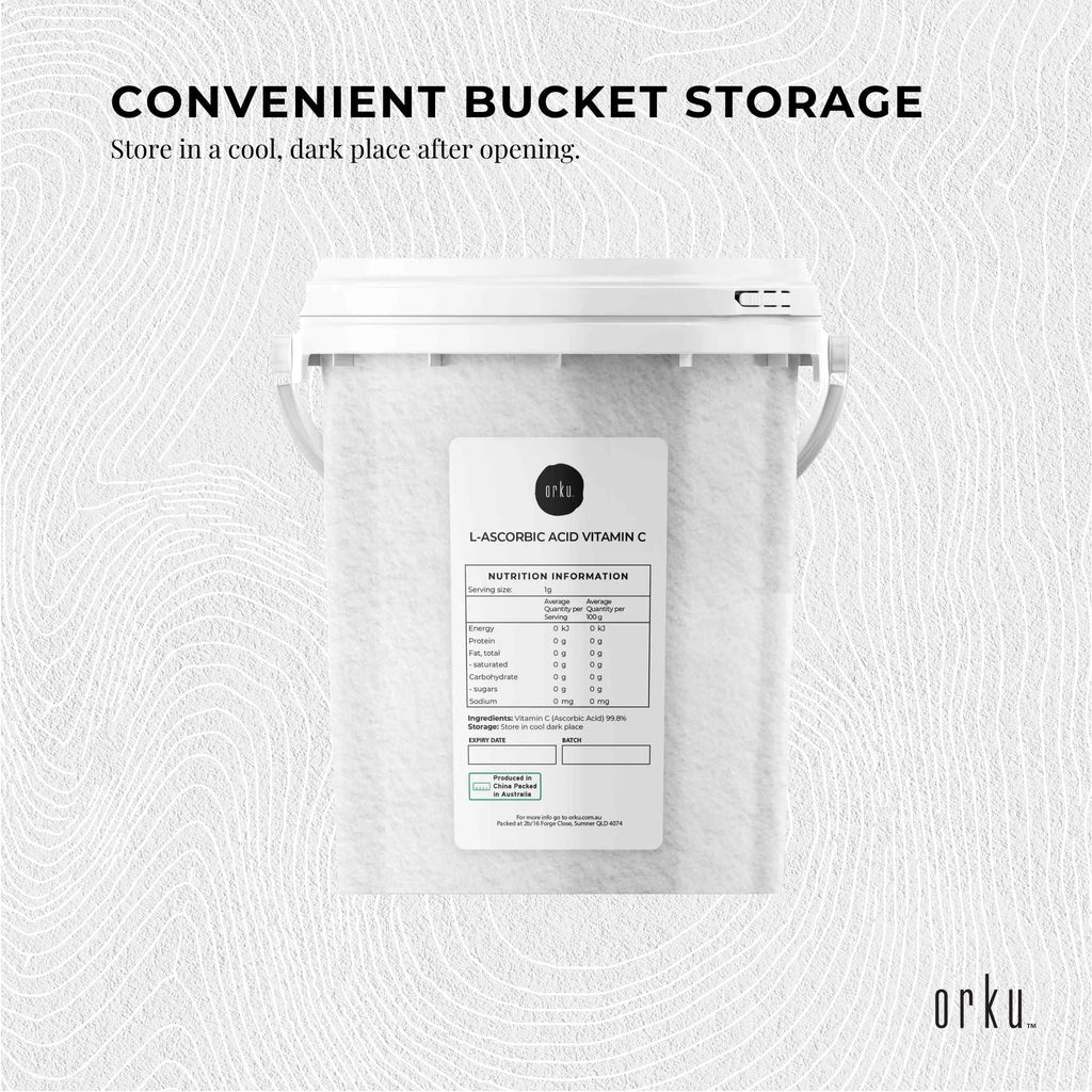 Pure Vitamin C Powder available in in resealable buckets.