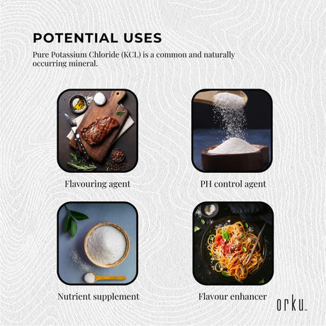 Pure Potassium Chloride (KCL) E508 is a food grade powder that comes in a resealable bucket tub. It is a common and naturally occurring mineral. It is generally used to provide potassium enrichment in foods and as a salt replacer to reduce the sodium content in food.