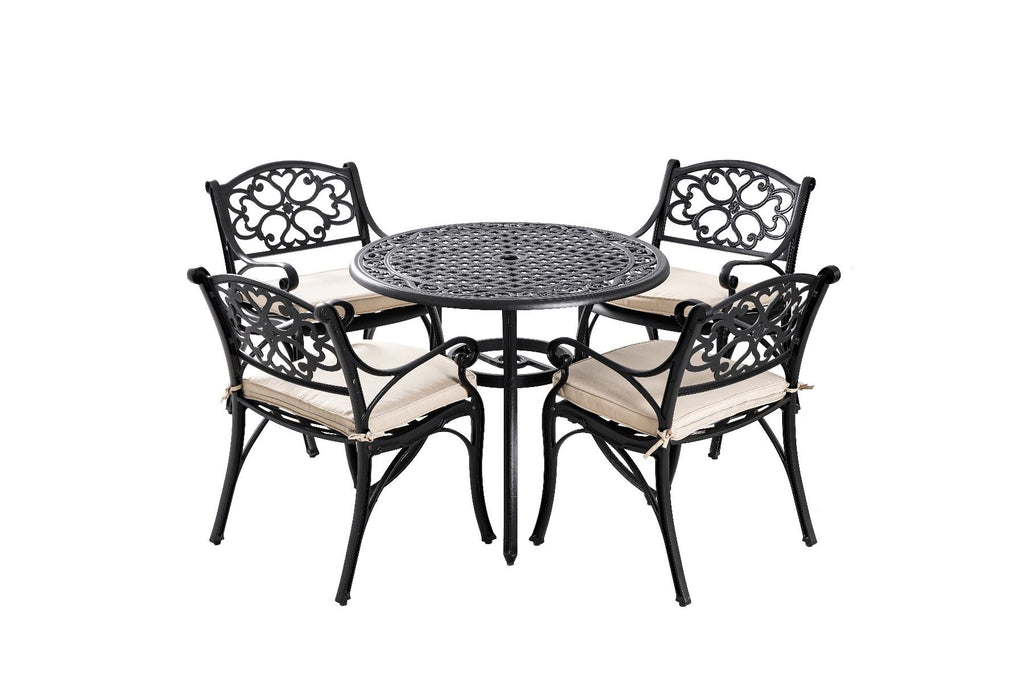 The Marco 5 Piece Cast Aluminium setting is lightweight but very sturdy. It is great on a balcony in a courtyard or in that cozy corner of your garden where you like to take a cup of tea or a cocktail with a friend.