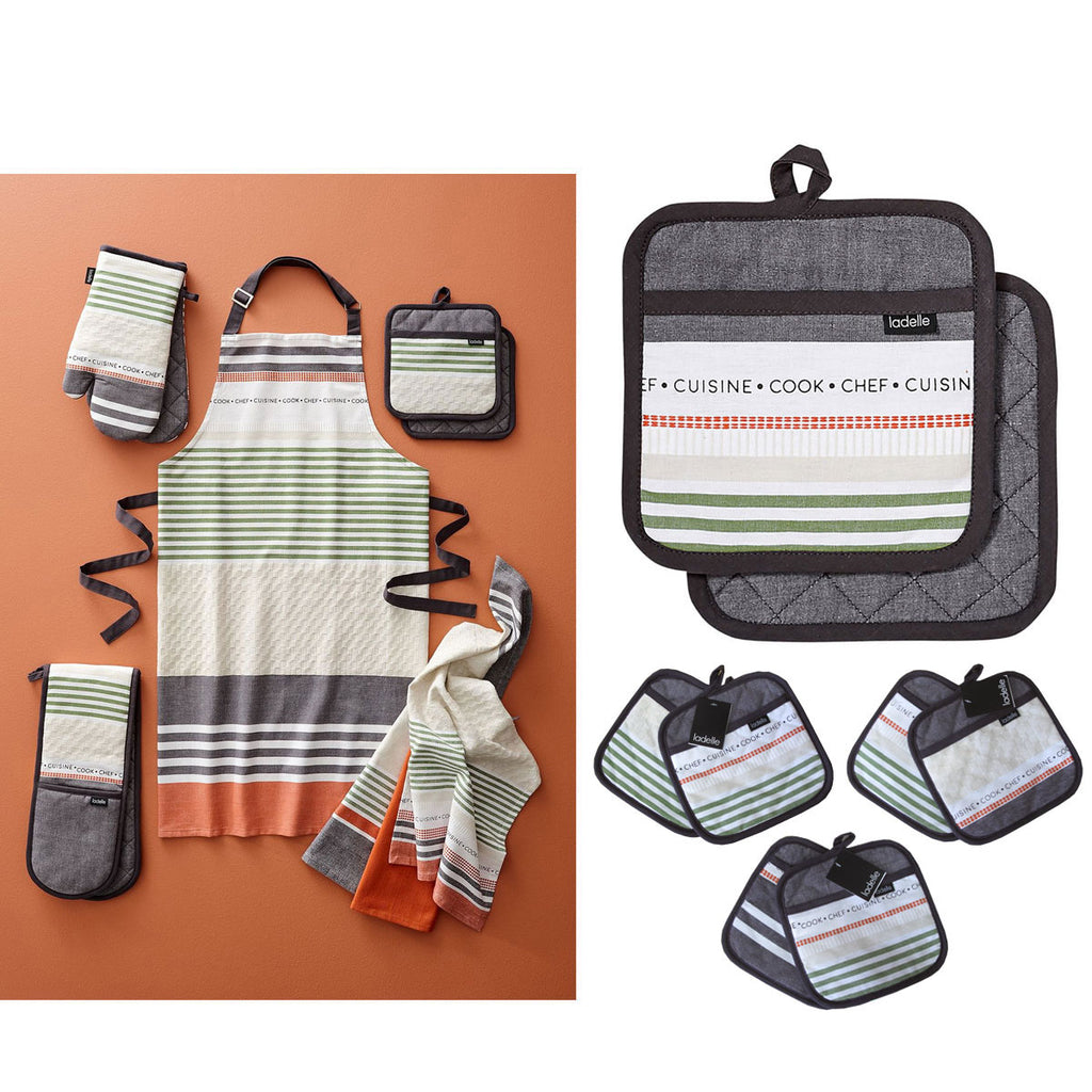 The Intrinsic Grey Set of 2 Pot Holders 21 x 21 cm by Ladelle will stylishly protect your hands from the heat while handling hot pots and dishes. 100% AZO free dyes. Made to European Quality Standards. A convenient kitchen accessory that keeps your hand safe while cooking. It features quilted design highlighted with stripes pattern in white, grey, taupe, green, and coral red colour tones. It is made from quality 100% Cotton fabric and Polyester fill.