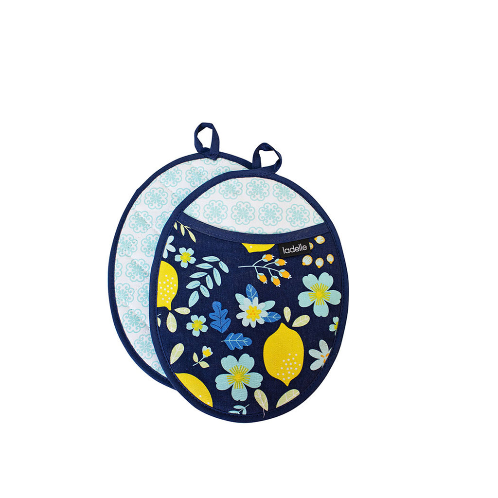 Inspired by the Mediterranean lifestyle, Positano Navy Set of 2 Pot Holders 19 x 24 cm by Ladelle is both stylish and practical. 100% AZO free dyes. Made to European Quality Standards. Featuring prints and colours that are inspired by lush fruitful gardens in white, navy, aqua, teal, yellow, and green colour tones, these pieces will fit right in to any home. Set of 2 cotton pot holders. Features a pocket for your hands on the front. Gorgeous lemon print on the front with tile print on the back.