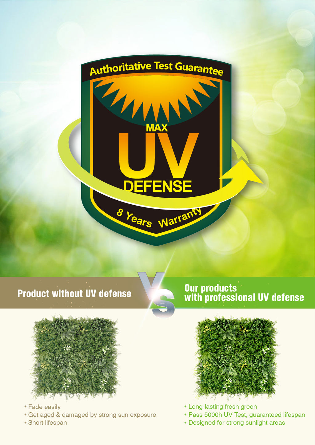 • SGS Certification and Intertek UV Certification: Our artificial boxwood panels are SGS certified and are absolutely safe, environmentally friendly and non-toxic. Greenery panels are made of new PE for durability and UV protection, and are tested and certified for light aging under UV exposure.