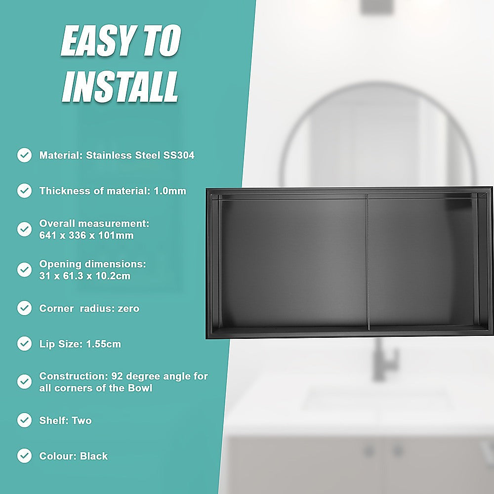641 x 336 x 101mm Shower Niche Double Shelf Organizer No Tile Needed in Black