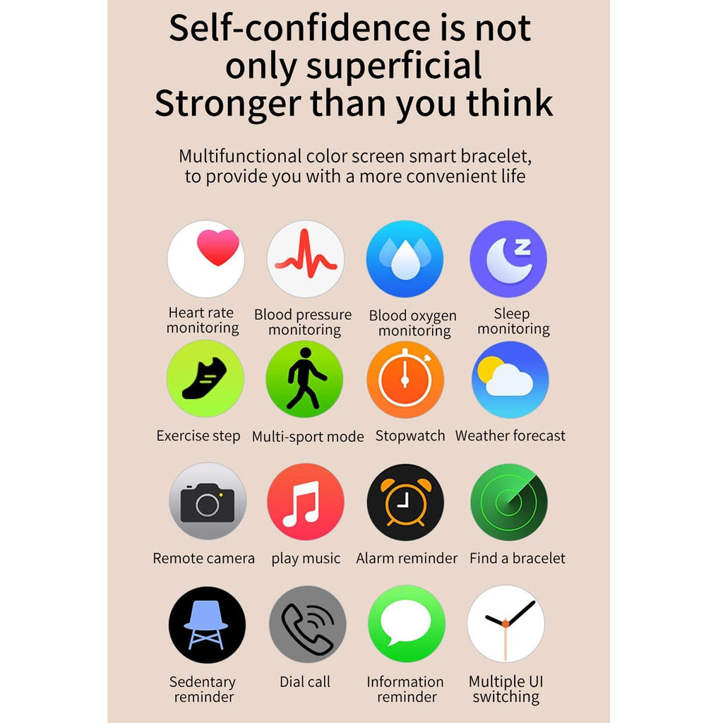 • Functions include call, SMS, WeChat, and QQ reminder push, exercise tracking, sleep monitoring, sedentary reminder, calorie calculation, stopwatch, heart rate and blood pressure monitoring, vibration, exercise mode, remote camera, music control, smart alarm, weather forecast, multi-dial switching, and more