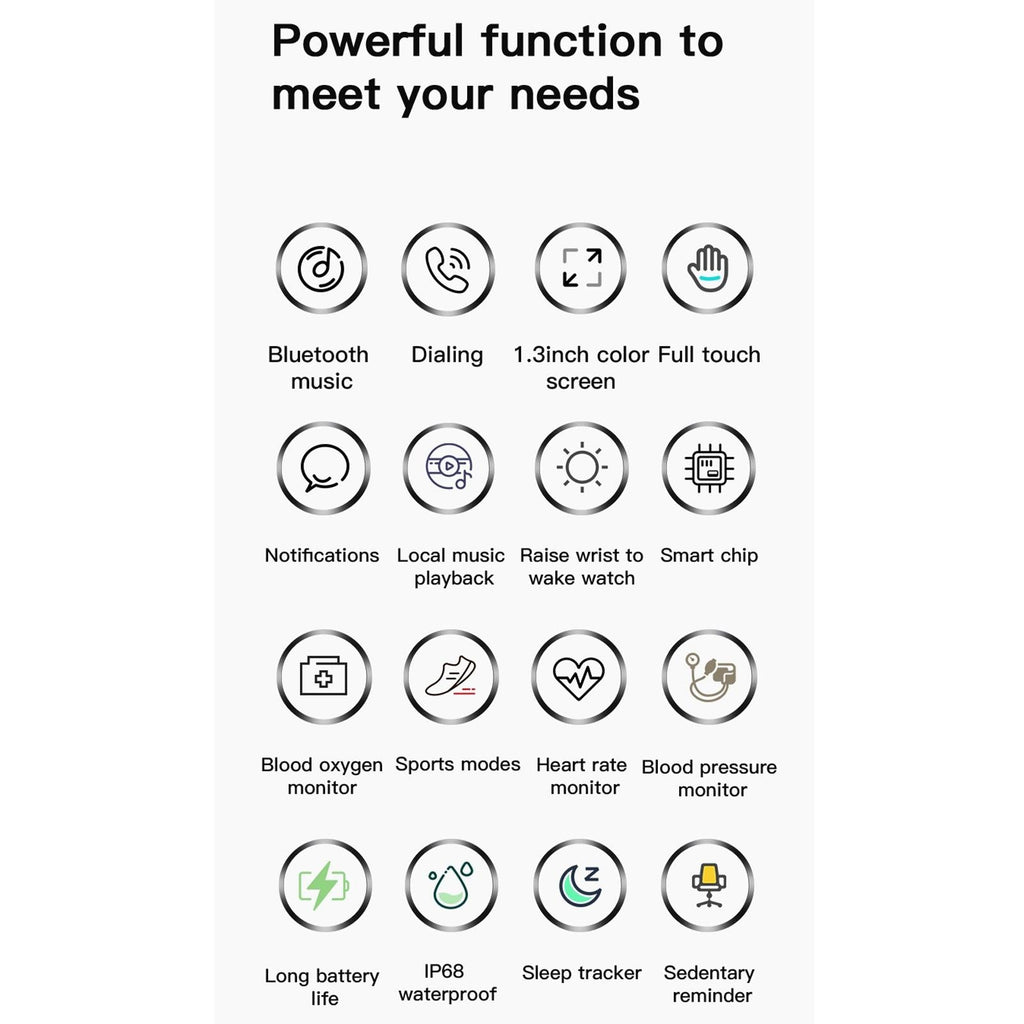 • Functions include Bluetooth call, local music playback, step counting, calories, distance, multi-sports mode, sleep monitoring, call reminder, message reminder, sedentary reminder, alarm clock reminder, shake photographing, heart rate monitoring, blood pressure monitoring, and blood oxygen monitoring