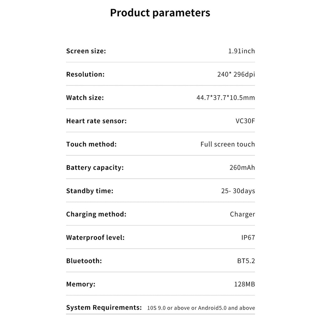 • 1 x 1.91 Inch Bt5.2 Smart Sport Watch Support Sleep / Heart Rate / Blood Oxygen / Temperature / Blood Pressure Health Monitor