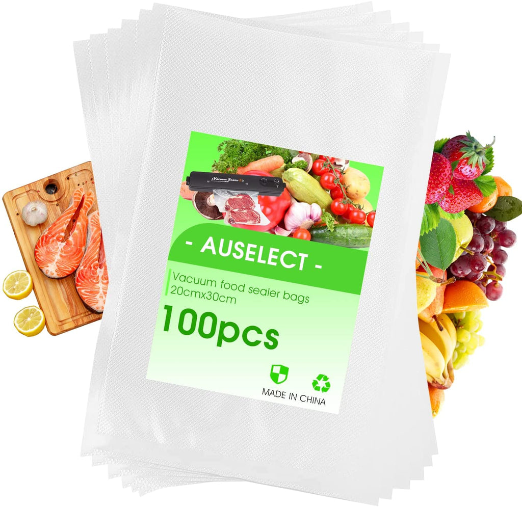 100 Pack AUSELECT 20cm*30cm Bags- a heavy-duty & economical alternative to Food Storage, Seal a Meal and compear with other brand name food sealer bags. High in quality, economical in price.