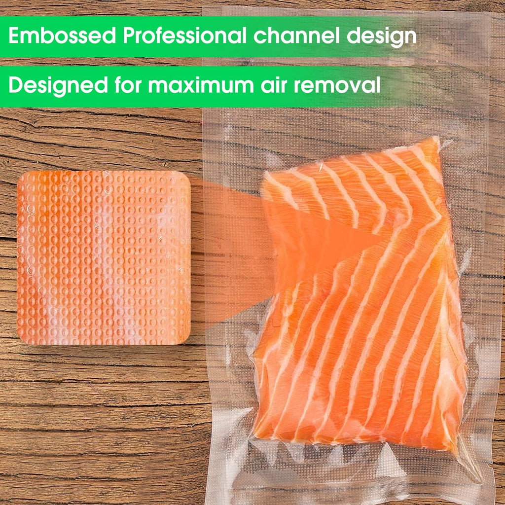 Heavy-Duty Commercial Grade Quality - Designed with 3.5 mil front panel, 4 mil embossed back panel provides a max air-free pack locking in freshness and flavor. Under vacuum your foods will last 3 to 5 times longer with no freezer burn or dehydration.