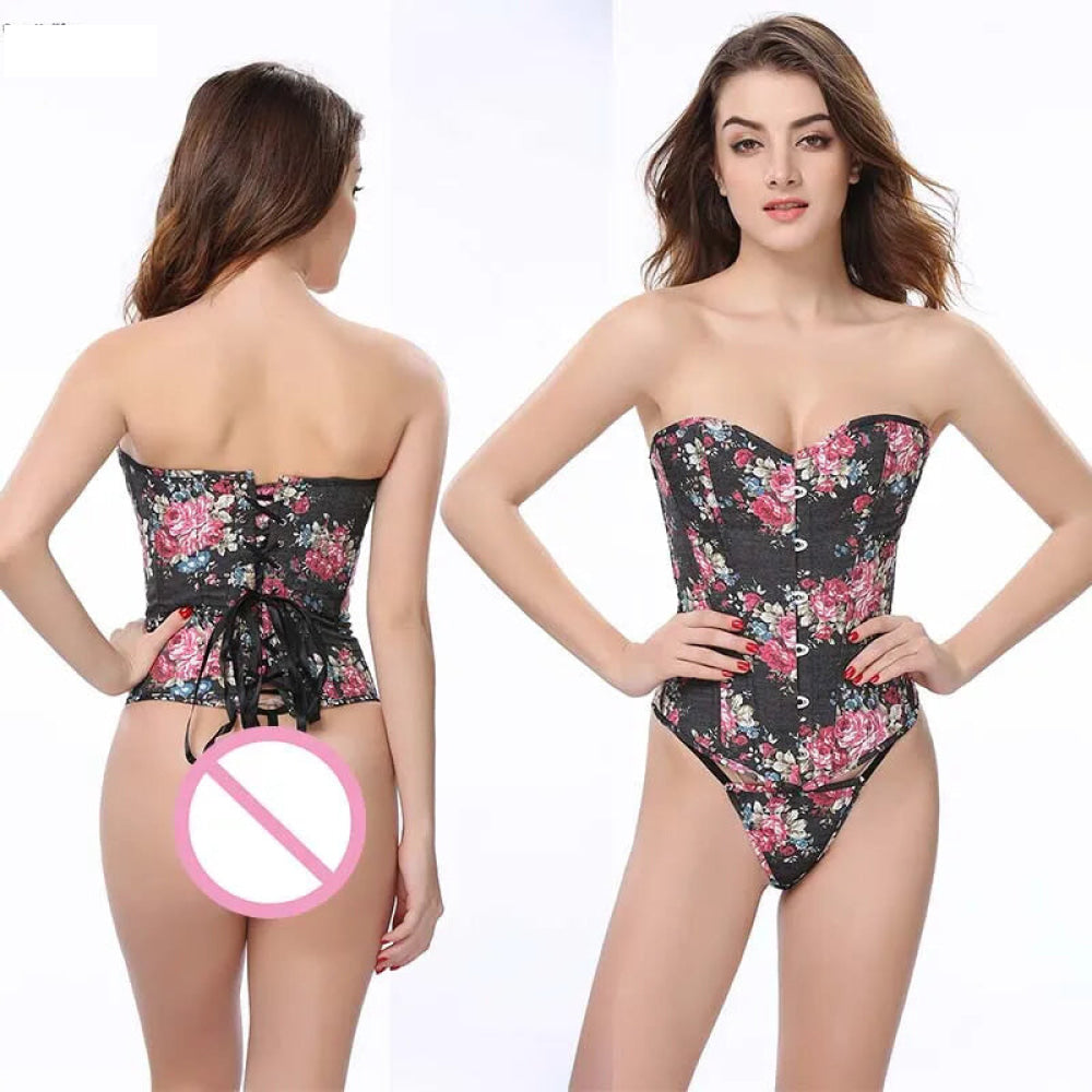 Floral Lace-Up Denim Corset Plus Size S-6Xl Boned Strapless Blue / Black - Black - Xl