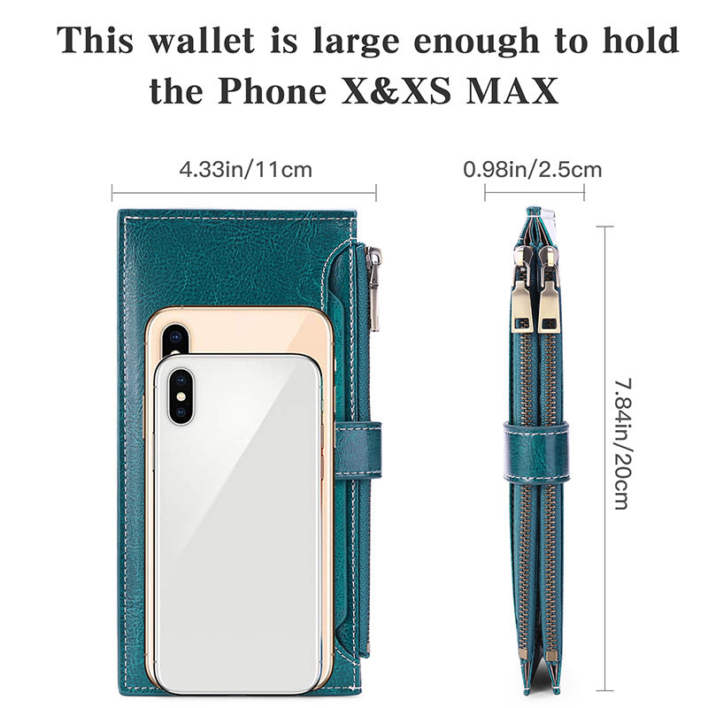 This vintage-inspired wallet is crafted from premium oil wax leather, offering a luxurious look and feel. With an impressive 19 card slots, 2 ID windows, 2 SIM card slots, and 2 zipper pockets, you'll have plenty of room to store all your essentials. Plus, its RFID blocking technology keeps your cards safe from electronic theft. Large enough to hold your phone, this wallet is the perfect combination of style and functionality.