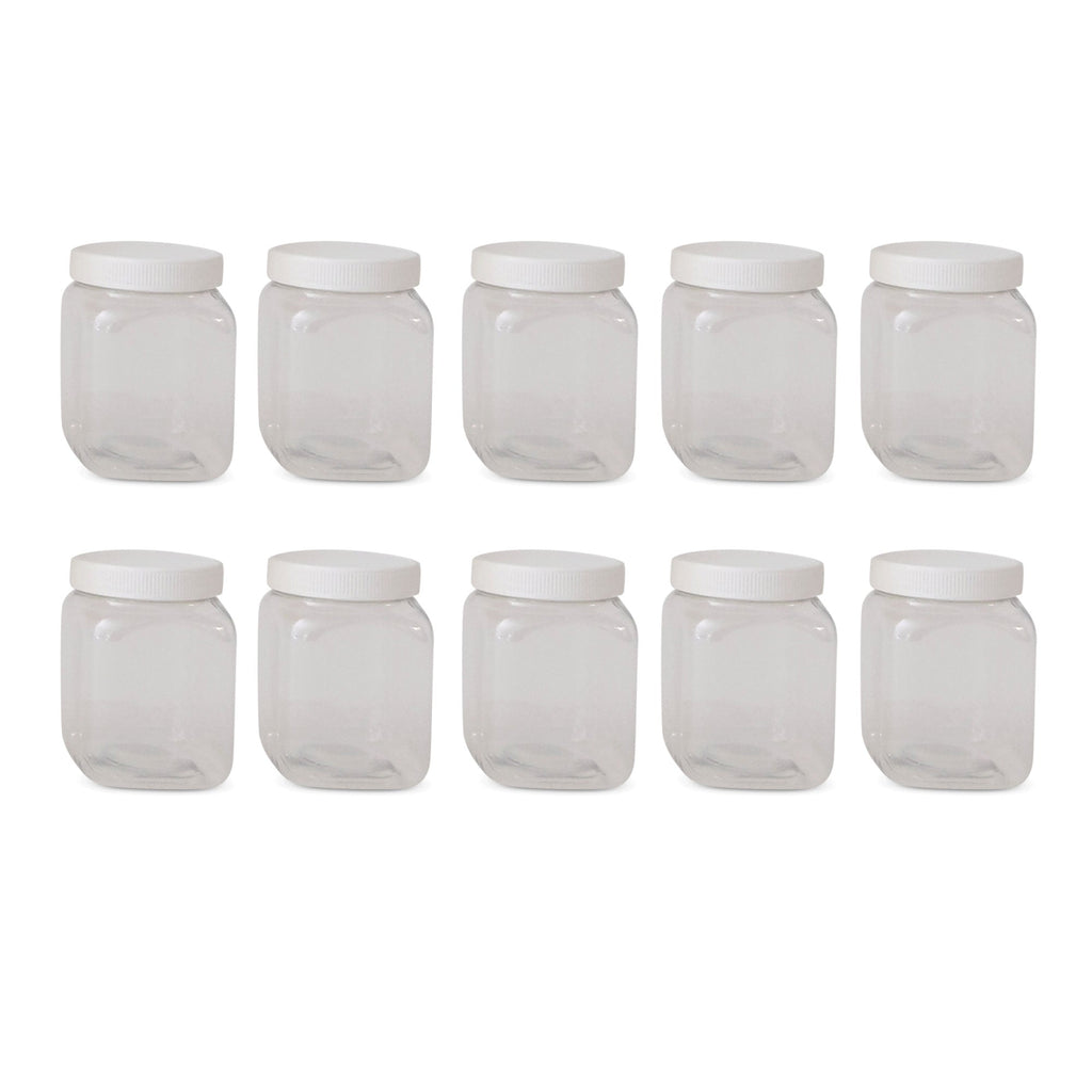 Square plastic empty food grade jars with white lids, commonly used for packing food products and items such as beads, crafts, decorations, honey, grains, beans etc.