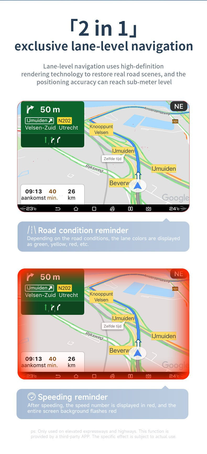 • Advanced Navigation Features (App Dependant): Includes lane-level navigation, road condition reminders (visualized by lane coloring), and speeding reminders.