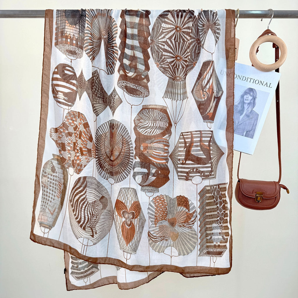 2-Piece Brown Border Retro Lantern Print Scarf - Fashionable Niche Design for Women