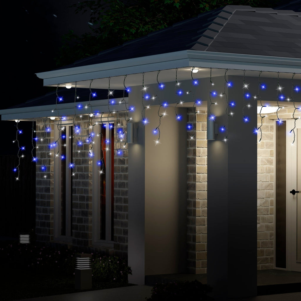 Enhance your festive décor with our 300 LED Icicle Lights. Featuring a striking blue and white color combination, these lights also come in Cool White, Multicolor, and Warm White options. With a 5.9-meter lit length and 5-meter cable, they offer a stunning display with 10 cm spacing between each light. Enjoy a mix of flashing effects and a steady glow, all controlled by Memory Hold Technology. Perfect for both indoor and outdoor use.