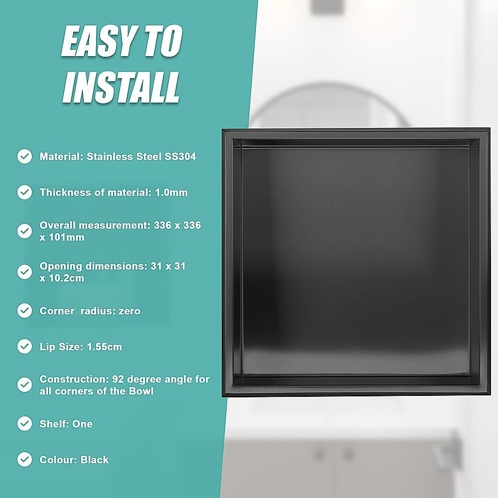 336 x 336 x 101mm Shower Niche Single Shelf Organizer No Tile Needed in Black