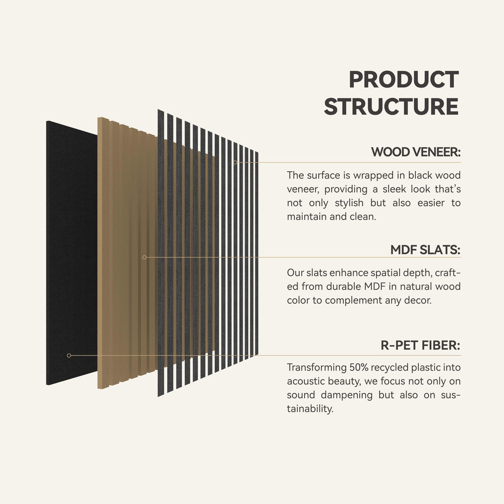 - Material: Made of wood-textured laminate, eco-friendly MDF, and high-density acoustical polyester fiber, ensuring durability and excellent sound absorption.