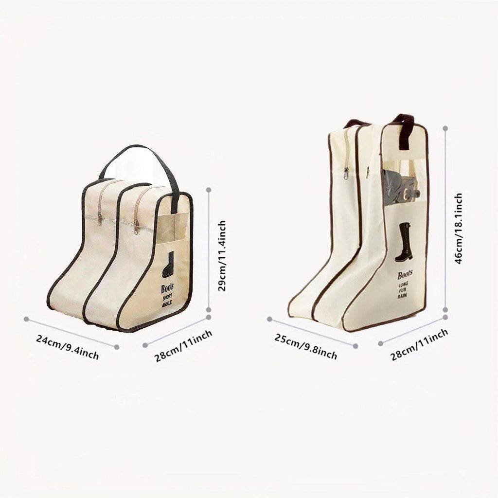 Organize and protect your shoes and boots with this set of 4 beige storage bags, ideal for both travel and home use. These durable bags are designed for both short and long boots, providing a dustproof solution that keeps your footwear clean and tidy. Each bag includes a transparent window for easy identification of contents, along with a secure zipper closure for quick access. The lightweight, portable design features an ergonomic handle, making it convenient to carry. Perfect for neatly storing shoes and saving space in your home or while travelling.