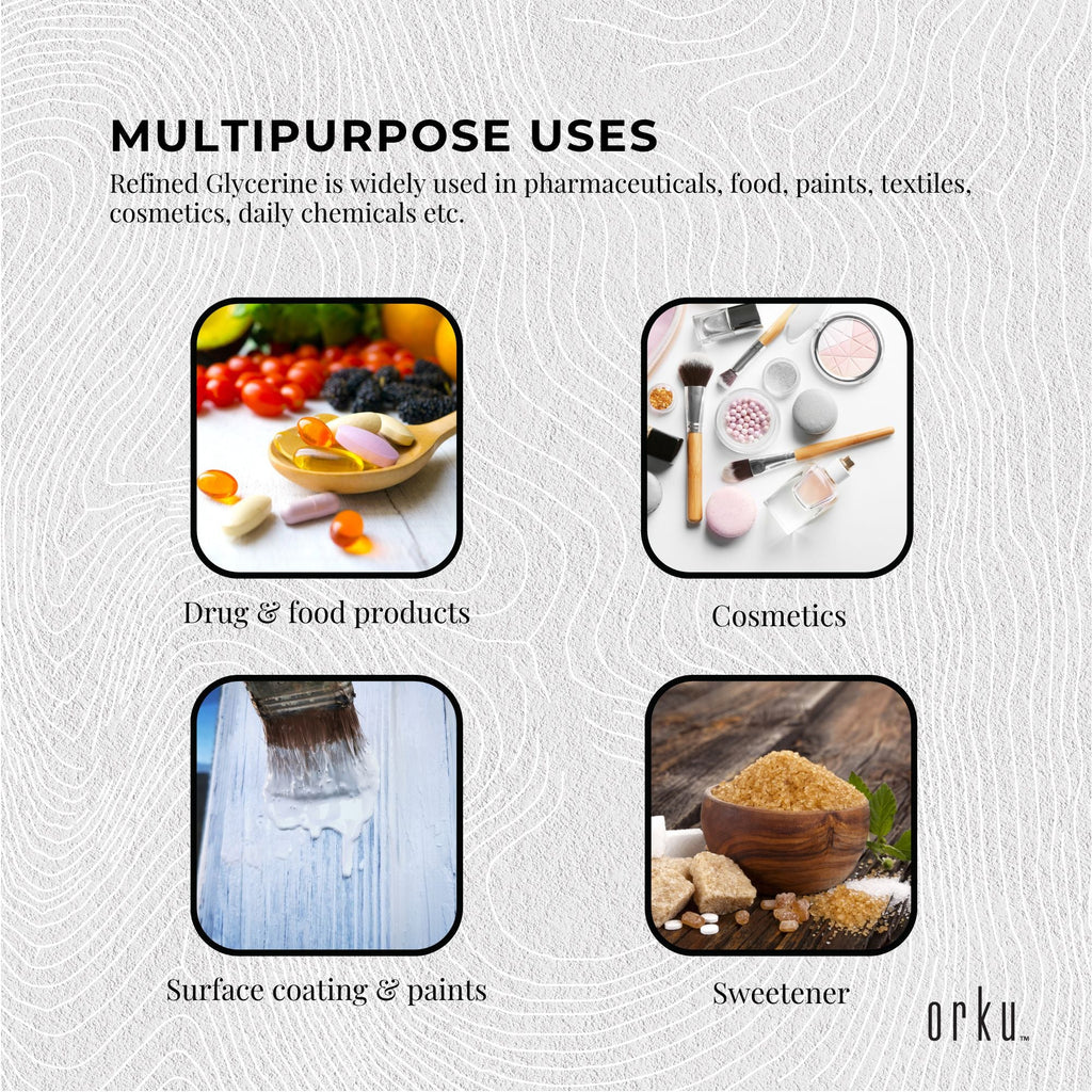 Refined Glycerine is colourless and odourless, sweet-tasting viscous liquid and it is hygroscopic. It has well solublizer, plasticiser, moisturising and preserving agent.