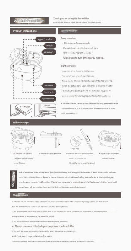 This product does not contain a built-in lithium battery; it operates via USB power. Before first use, please remove the cotton swab and soak it in water for 2 minutes to fully absorb water before reinstalling. Ensure the spring at the bottom of the cotton swab tube is not lost, as this will affect the spray function. Keep the device upright during operation to prevent water spillage. Clean the water tank and change the cotton swab regularly for optimal performance and hygiene. This humidifier is a decorative and functional item; it is not a toy. Keep out of reach of very young children when filled with water or operating.