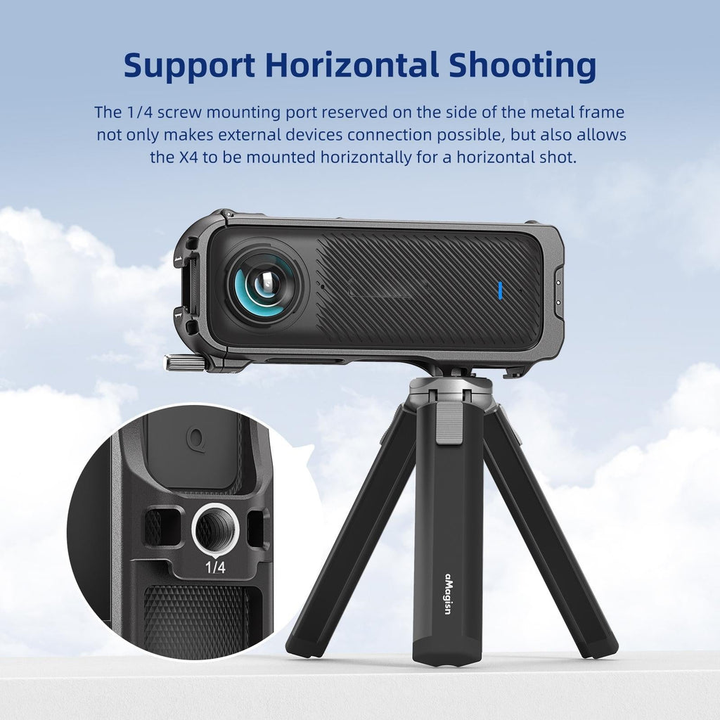 • Suitable for Insta360 X4 metal protective frame + lens cover set. Compatible with 1/4-inch threaded interface, the dual cold shoe openings are widely expandable and can be connected to external fill lights, microphones, selfie sticks, etc.